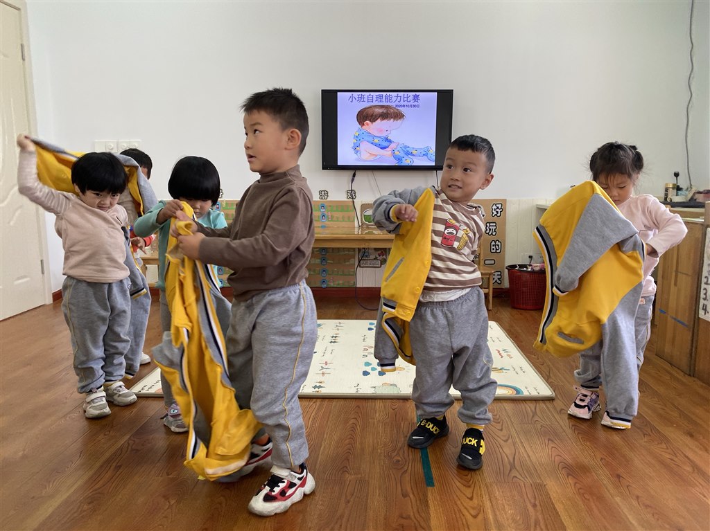小班组——穿脱衣服、鞋子。小班的孩子自入园以来在老师和家长的协同指导下自理能力获得了进步,为了进一步提高孩子的自理能力,树立我能行的思想观念,从小学会照顾自己,增强自信心。通过我会穿衣、我会穿鞋的活动,让孩子学会自己的事情做。活动中他们不仅体验到了参与游戏活动的乐趣,在活动中深深感受到了童年成长的快乐。