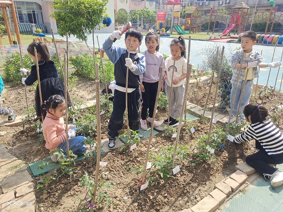 种植园是幼儿认识自然、探究自然的窗口,在亲历种植的过程中,幼儿学会了观察,学会了发现,学会了管理。大一班幼儿种植的番茄苗已经开始逐渐长大。大班幼儿已经具备一定的探究能力,他们了解到番茄的生长需要支撑物,于是,孩子们开始讨论“怎样为番茄搭架子”。小组计划,收集材料,通过直接感知,亲身体验,实际操作来进行科学种植探究活动。在探究中鼓励幼儿分工合作,你来插棒,我来绑蔓,一起来为番茄搭架子。在活动中,孩子们体验到了种植劳动带来的快乐。